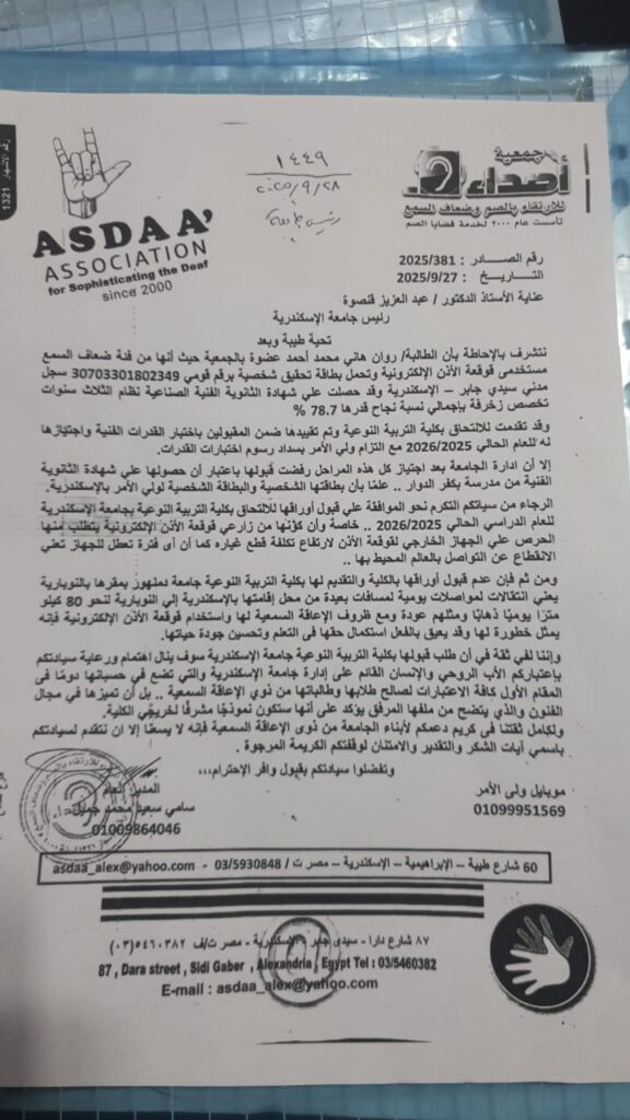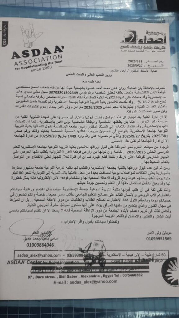 “ابنتي تجاوزت كل الصعوبات، واجتازت اختبار القدرات الفنية للالتحاق بكلية التربية النوعية بجامعة الإسكندرية، وسددنا كل الرسوم المطلوبة، وقدمت الجمعية الداعمة لفئة الصم و ضعاف السمع – جمعية أصداء لتنمية مهارات الصم – التماسًا رسميًا لجامعة الإسكندرية لقبولها، نظرًا لظروفها الصحية وبيانات إقامتها وتبعيتها لمحافظة الإسكندرية. ومع ذلك، فوجئنا برفض الجامعة قبول أوراقها، بحجة أن شهادتها الثانوية الفنية صادرة من مدرسة تقع خارج نطاق المحافظة.”