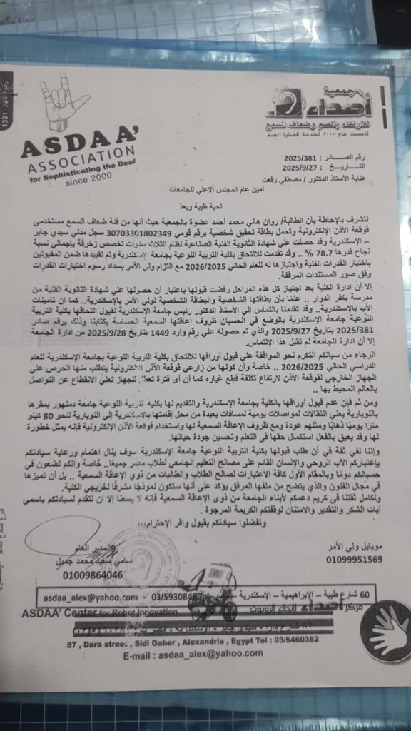 ويؤكد أن قبولها بجامعة الإسكندرية ليس مجرد مطلب أكاديمي، بل قضية إنسانية واجتماعية، تمس حق ذوي الإعاقة السمعية في التعليم الآمن والمناسب دون معاناة التنقل أو المخاطر الصحية.