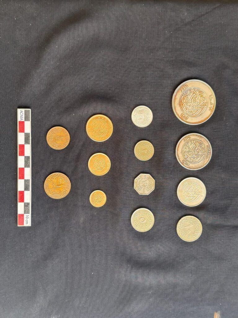 كما عثر بداخلها على ثلاث عشرة قطعة نقدية من فئات مختلفة، تراوحت ما بين المليمات والعملات الذهبية من فئة 100 قرش.
