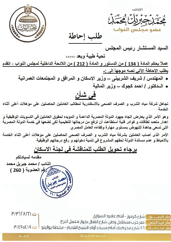 تقدّم النائب محمد جبريل، عضو مجلس النواب وأمين الشؤون البرلمانية لحزب مستقبل وطن بالإسكندرية، بطلب إحاطة إلى كلٍ من المهندس شريف الشربيني وزير الإسكان والمرافق والمجتمعات العمرانية، والدكتور أحمد كجوك وزير المالية، بشأن تجاهل شركة مياه الشرب والصرف الصحي بالإسكندرية لمطالب العاملين الحاصلين على مؤهلات علمية أعلى أثناء الخدمة.