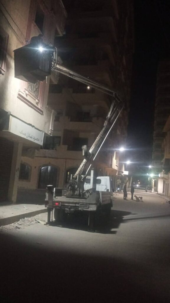 إصلاح عطل بالشبكة الهوائية المغذية لكشافات الإنارة العامة بمنطقة بيانكي (شوارع 8 و11 و15)، إلى جانب رفع وربط شبكة هوائية مقطوعة بمساكن طلعت مصطفى بالهانوفيل.