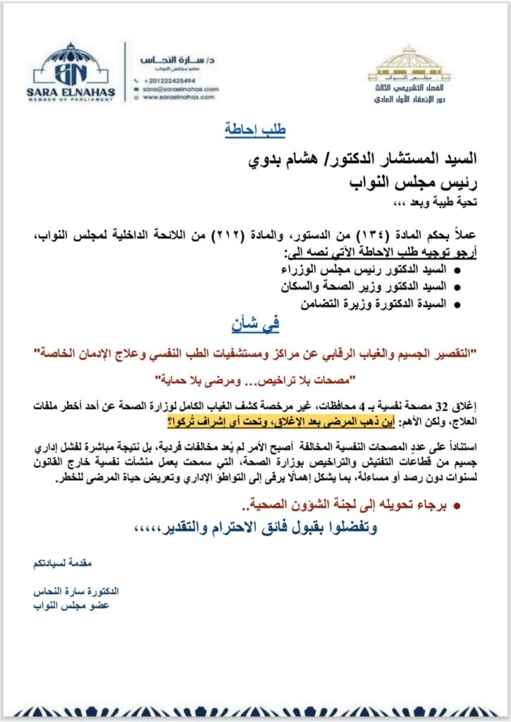 طلب إحاطة في شأن التقصير الجسيم والغياب الرقابي عن مراكز ومستشفيات الطب النفسي وعلاج الإدمان الخاصة