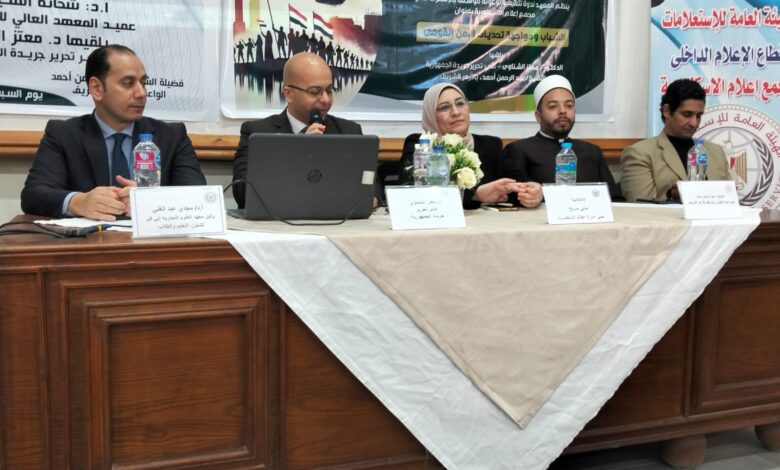 نظّم مجمع إعلام الإسكندرية، التابع للهيئة العامة للاستعلامات، ندوة توعوية بعنوان «الشباب وتحديات الأمن القومي»، بالتعاون مع المعهد العالي للعلوم التجارية بأبو قير، وذلك في إطار استراتيجية قطاع الإعلام الداخلي برئاسة الدكتور أحمد يحيى، بهدف تعزيز الوعي الوطني لدى الشباب، ورفع روح الولاء والانتماء للوطن.