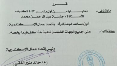 جليلة عبد الرحمن أمينا عاما مساعدا للجنة المرأة باتحاد عمال الإسكندرية
